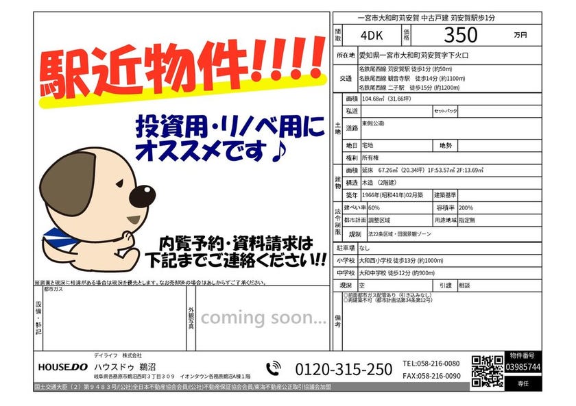 名鉄「苅安賀」駅まで徒歩1分!!