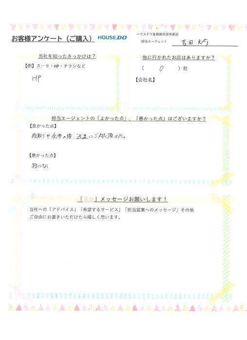 T様 この度は、ご成約おめでとうございます。 また、当店をお選び頂きましてありがとうございます! 何かご不安なことがございましたら、お気軽にご連絡ください。 今後とも、よろしくお願いいたします!